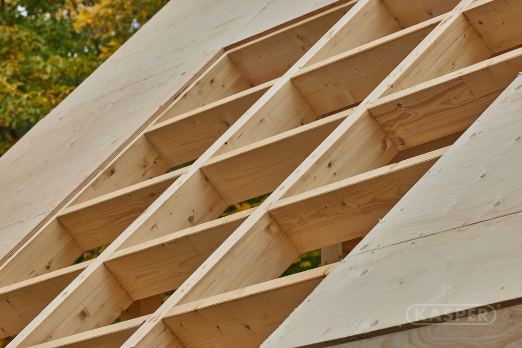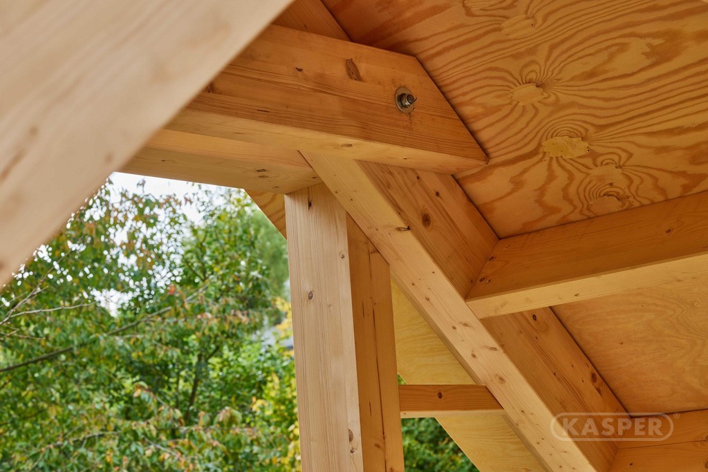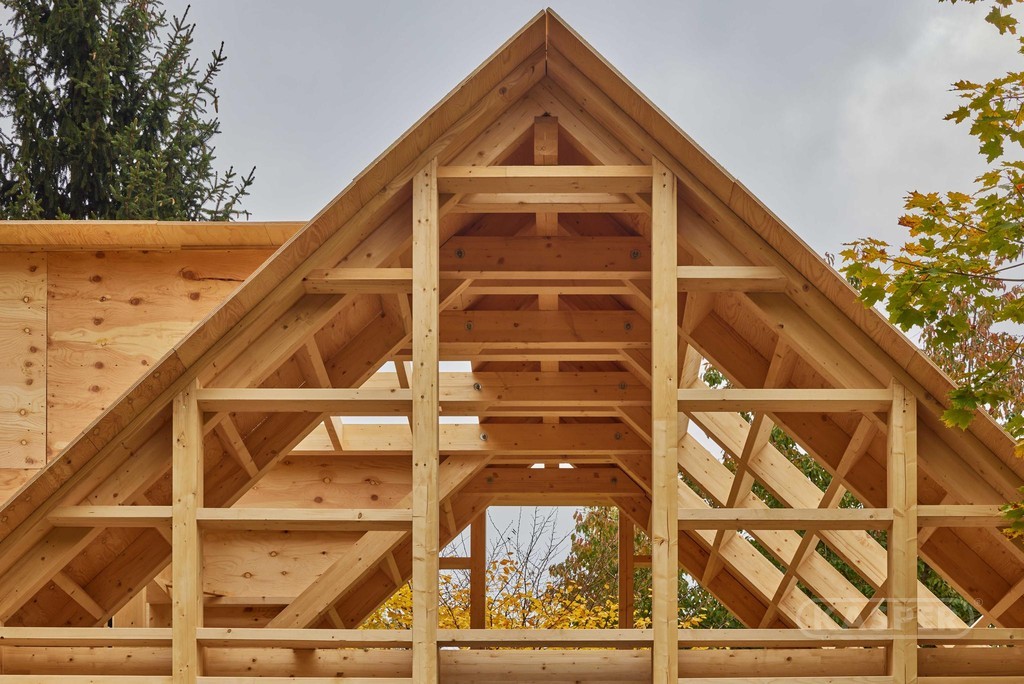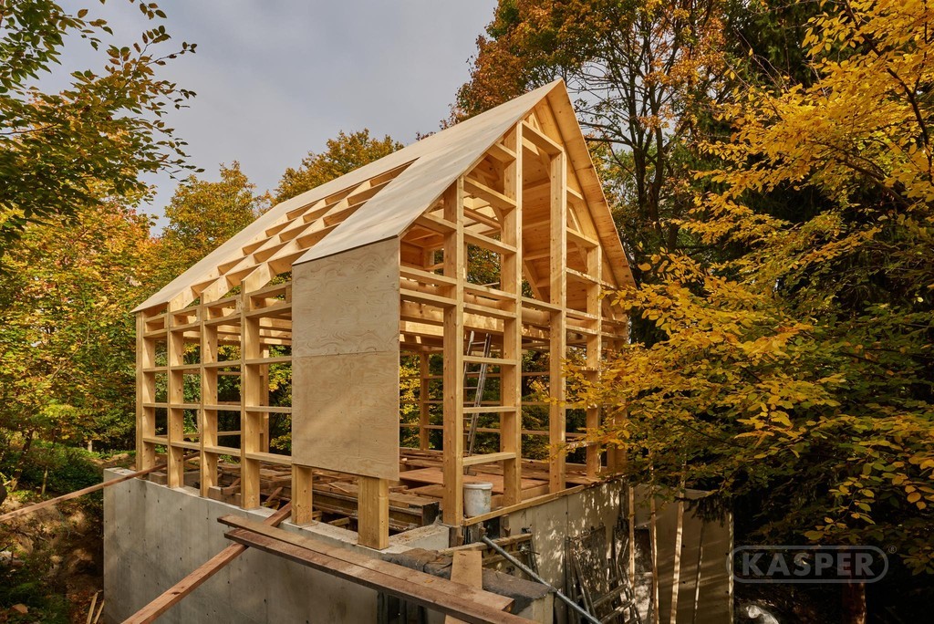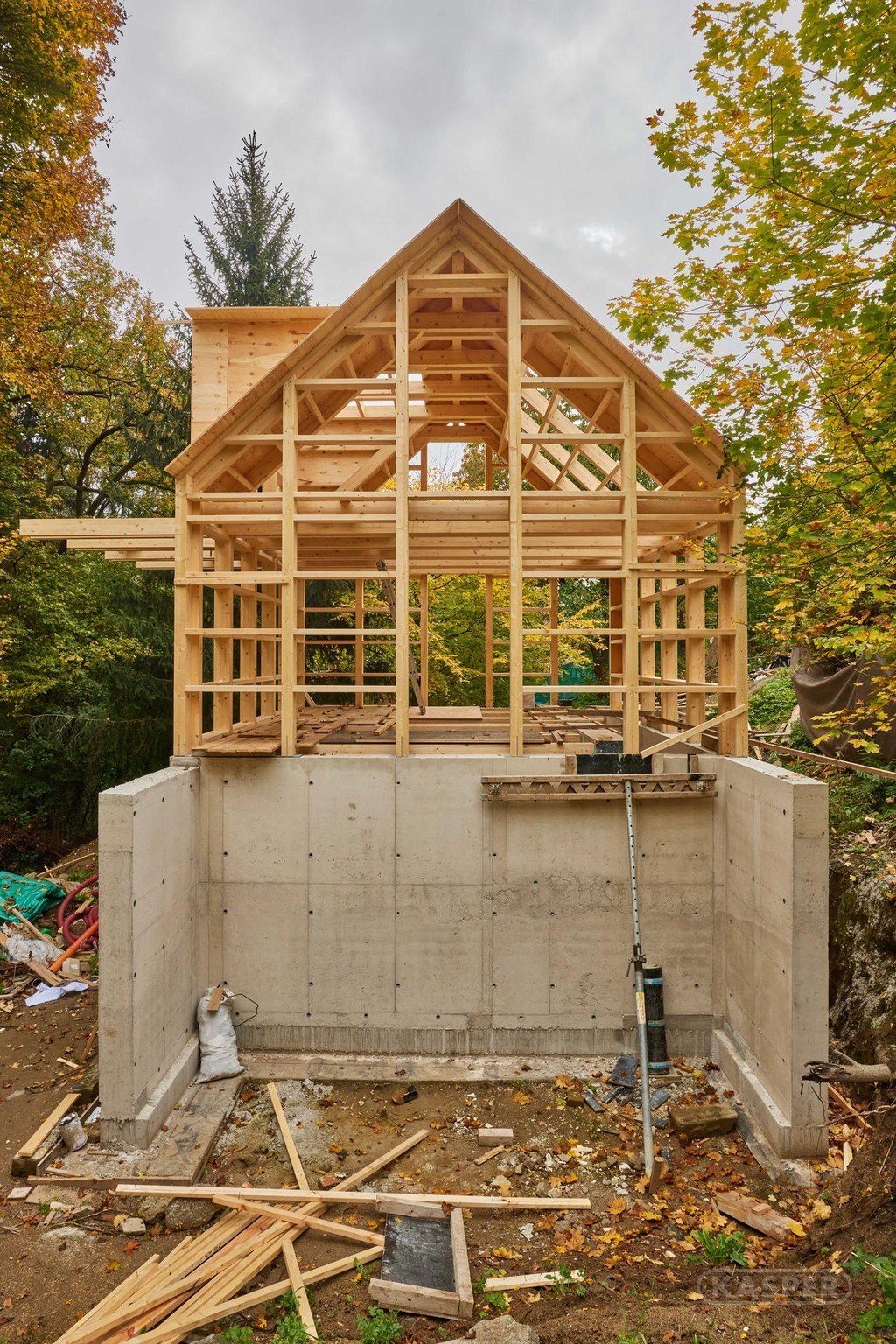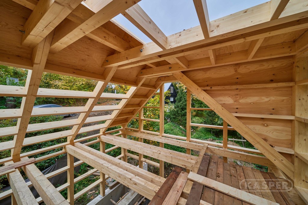 Tato konstrukce byla kompletně opracována na CNC stroji Hundegger K2i. Z výroby jsme kvůli místu stavby a jeho dostupnosti nemohli nic prefabrikovat, tudíž vše bylo řešeno až na místě staveništní montáží. Hlavními nosnými prvky jsou 2 krajní rámy z lepeného lamelového dřeva, mezi něž se umístila soustava několika linií rámů a paždíků ze sušených profilů KVH. Stropní trámy jsou na jedné straně vykonzolovány a tvoří balkon. Celkem bylo použito téměř 11 m³ dřeva. Zhruba polovina stavby je ještě opláštěna překližkou z borovice.